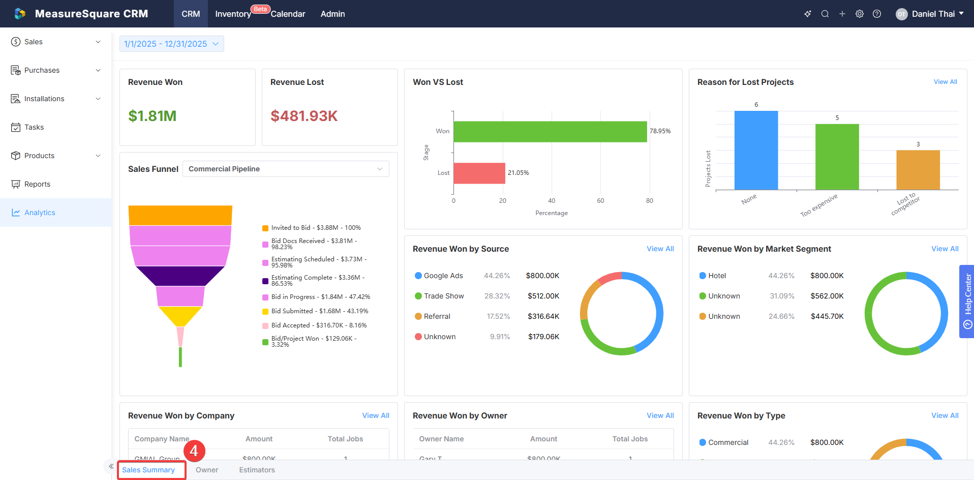 Revenue Won By Owner: Revenue and deal performance based on the owner of the project or deal.