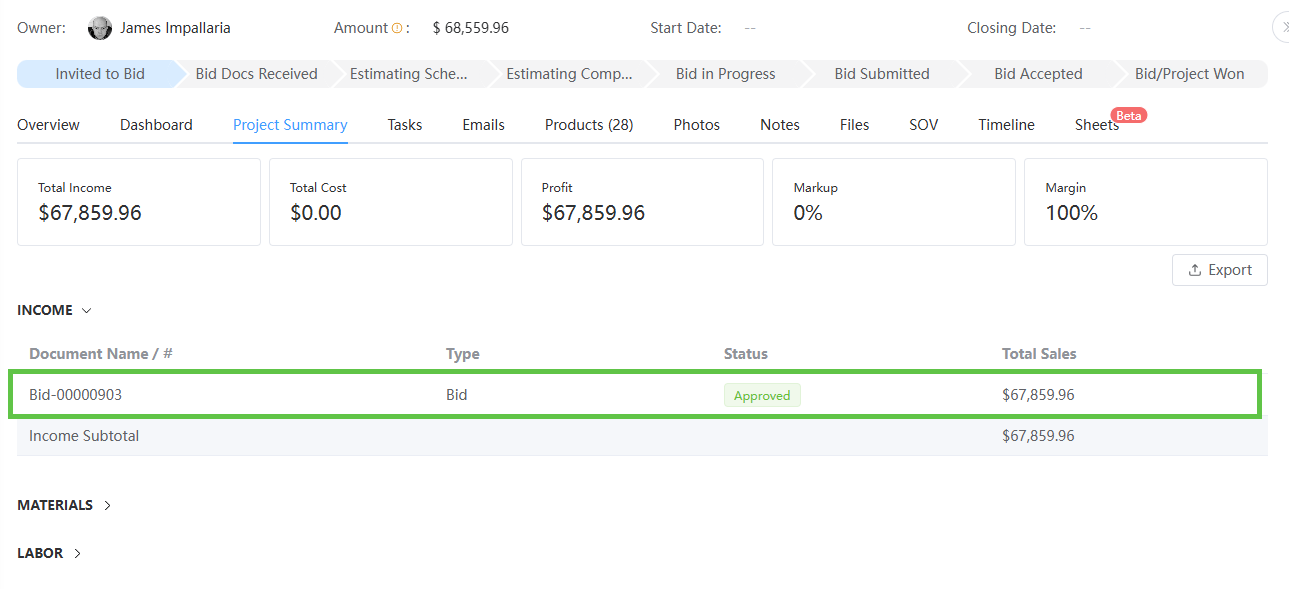 Your Project Summary will also begin tracking document-level totals, pulling information directly from your approved Bid or Quote.