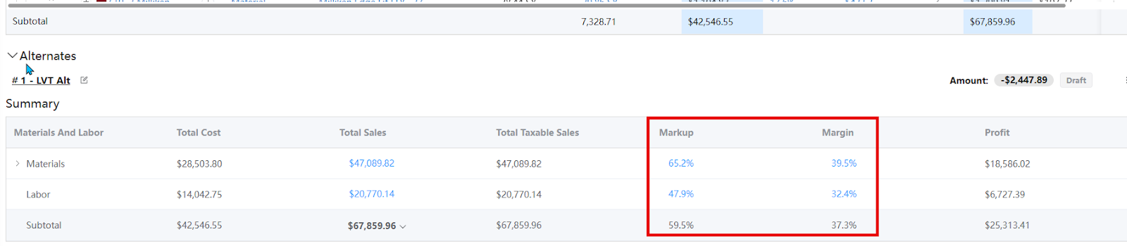 If you add products to an Alternate, the base bid will be unaffected at first. The quantities and pricing from the Alternate will only be shown within the Bid, and will not be applied to your reporting or analytics. You can have as many alternates as needed, and each Alternate will start as a Draft and can be Approved or Declined.