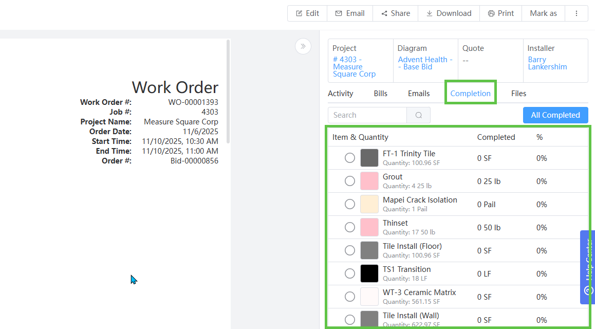 Work Orders include a Completion panel on the right-hand side.