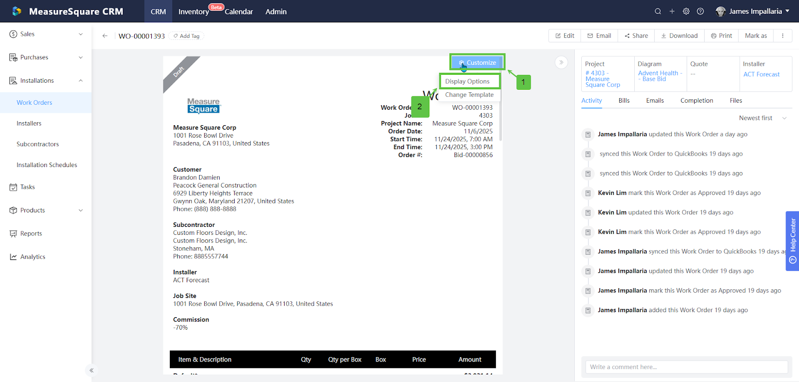 Work Orders (WOs) are the central unit for tracking labor and installation activity inside MeasureSquare CRM.
