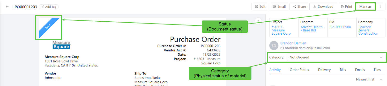 Using Status (document) and Category (material) together provides a clear and complete picture of your purchasing progress.