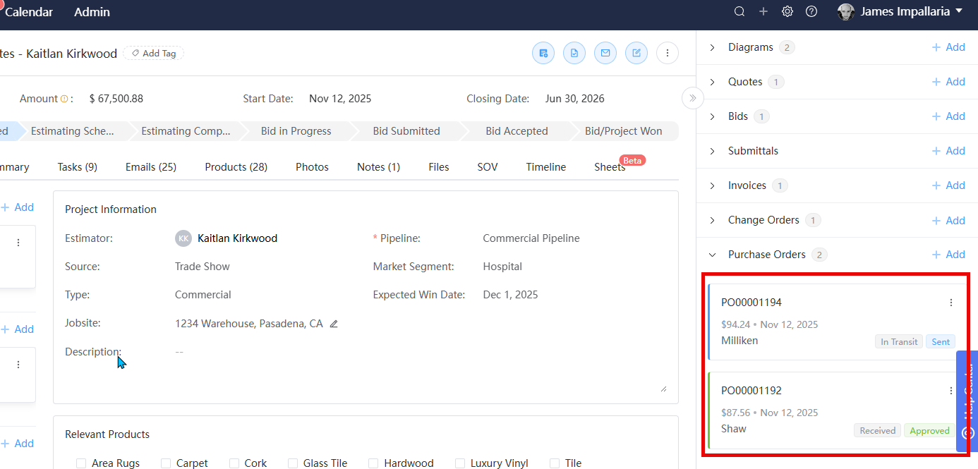 From the Project screen, these combined fields give you immediate visibility into what has been ordered, what has arrived, and what still needs attention.