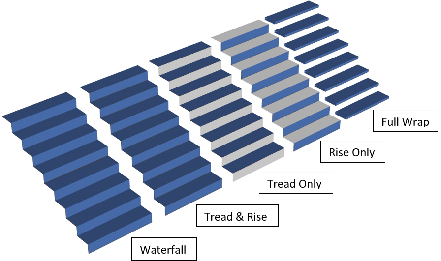 · Tread and Rise: Area product in separate pieces on tread and riser.