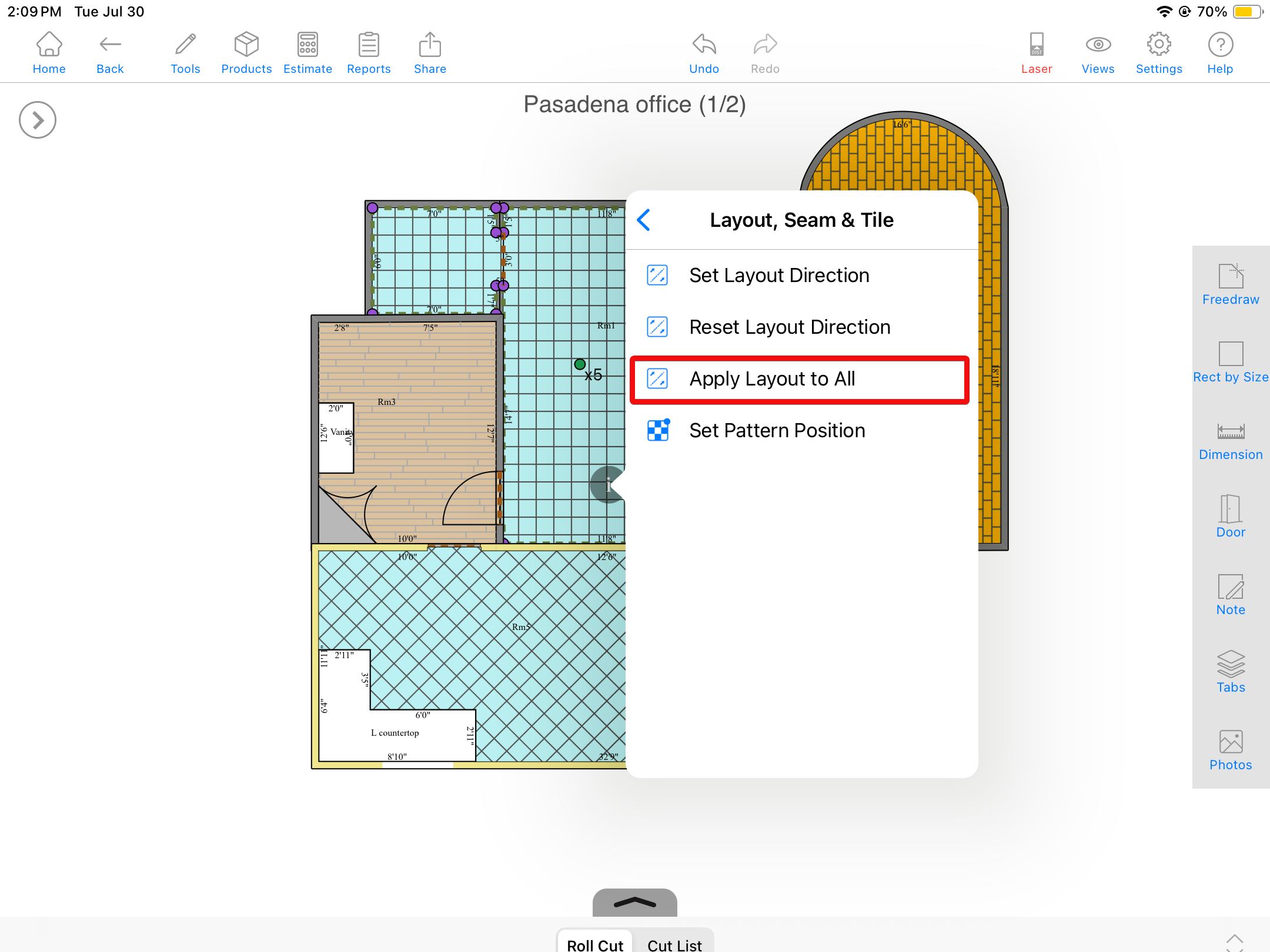 This is for MeasureSquare iPad. This can apply to any given material including the vinyl tile. Before trying to apply the layout to the current tab, make sure it already has the layout direction you desire.