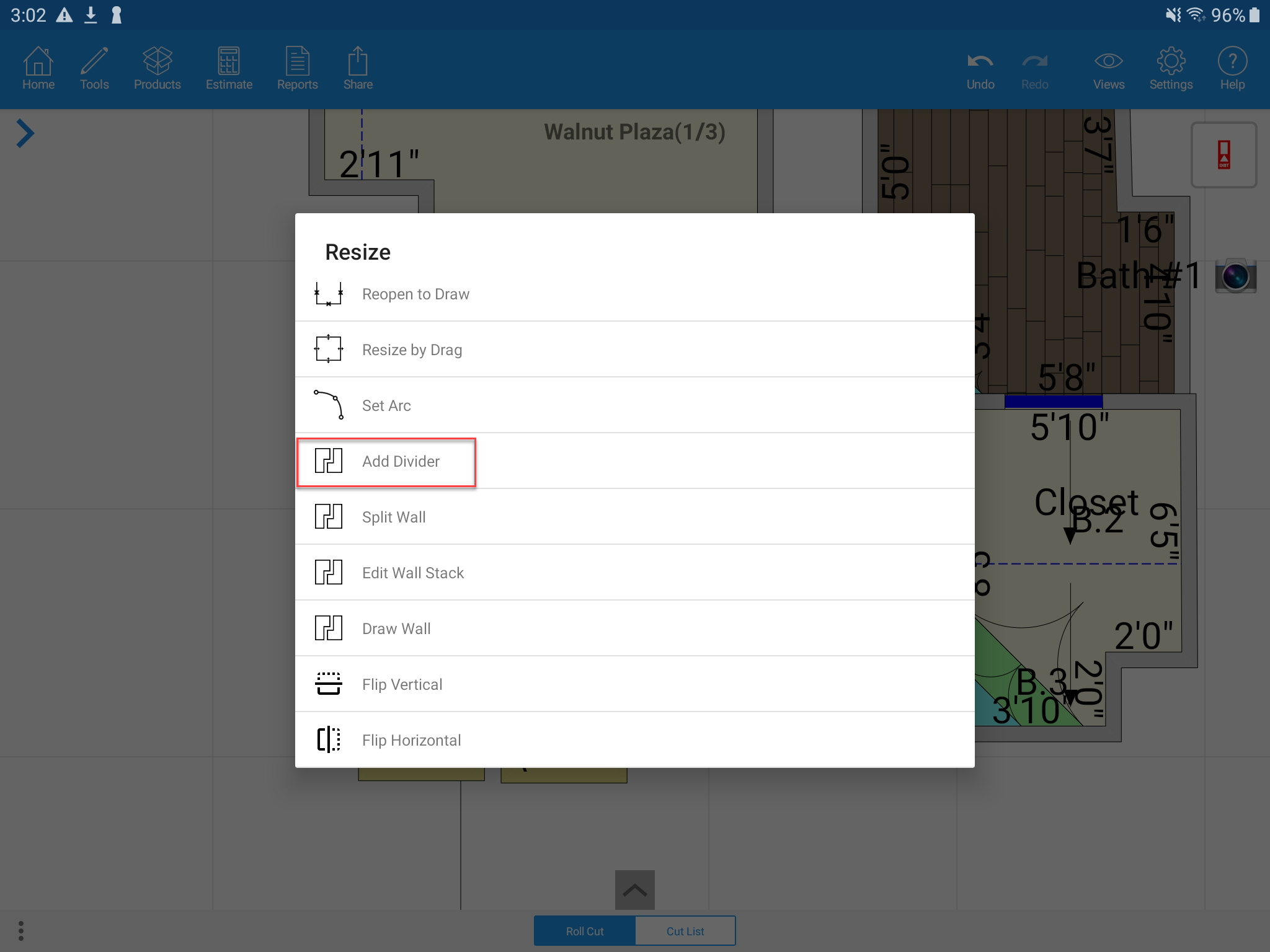 Step 2: Select Resize > Add Divider > Start drawing from the corner of the room to the other side of the room to complete the divider. Select the check mark at the top left.