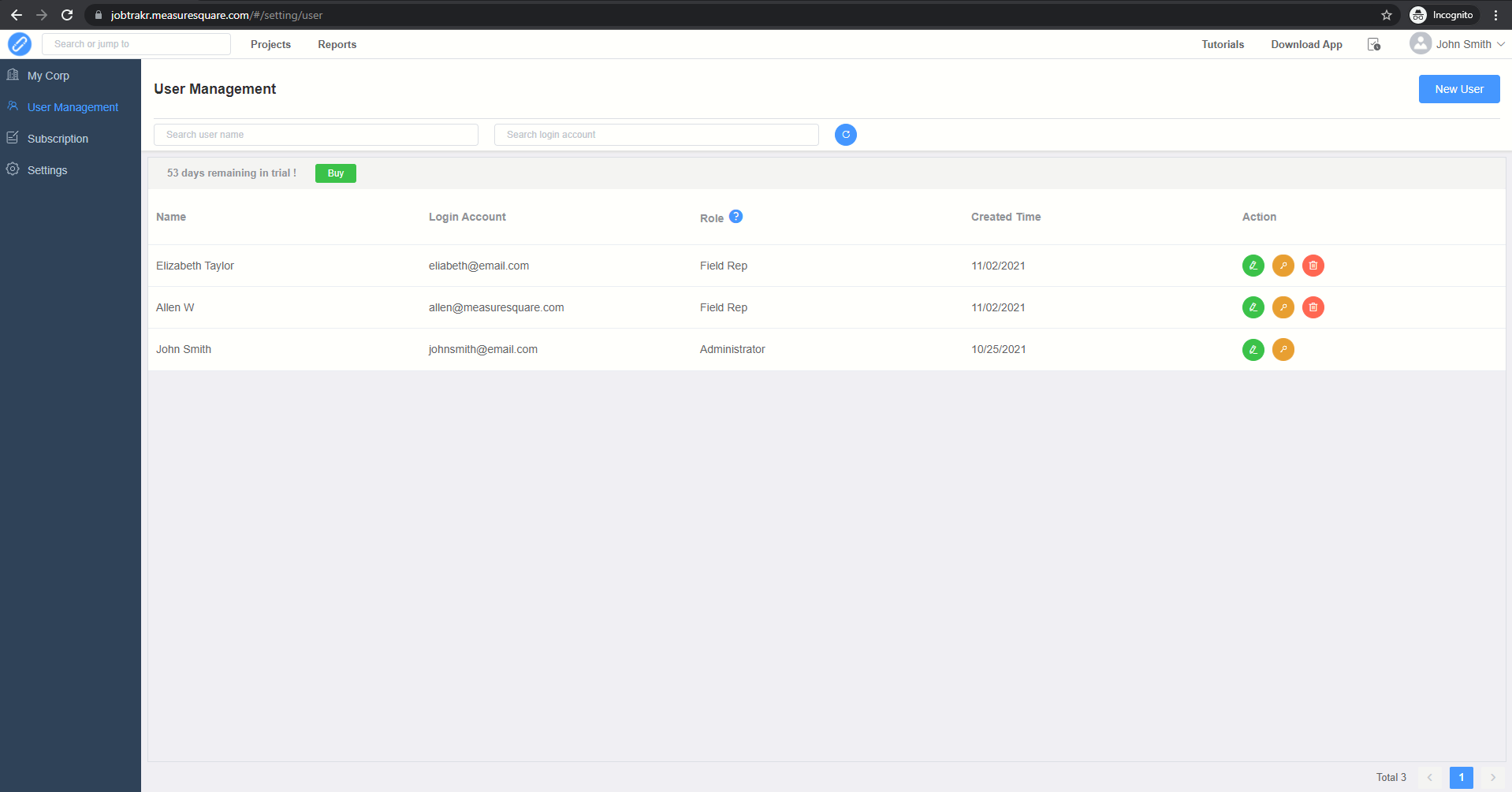 Step 4. Your new user will shown in your user list, as well as receive an invitation to download Job Trakr or log into Job Trakr Web.