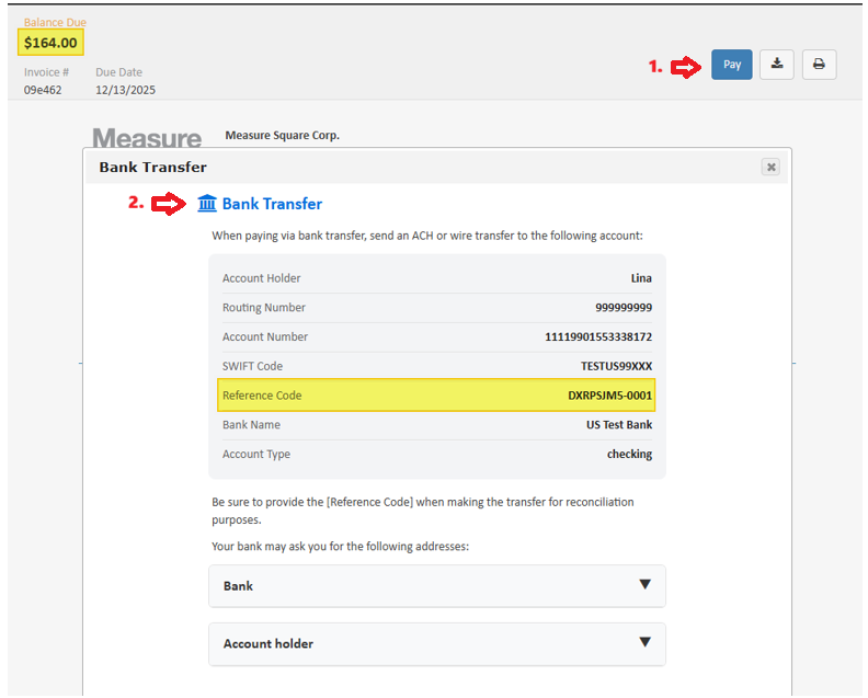Step 3: Click the "Pay" button to view the Bank Transfer details. Be sure to provide the correct Reference Code when making the transfer to ensure the payment will be processed successfully. Once we receive the payment from your bank, the invoice is paid successfully.