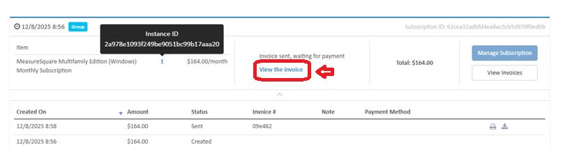 Step 2: After the subscription is created, it will automatically add the related licenses for the subscription items and generate a Sent invoice. Click "View the invoice" to open the invoice detail page.