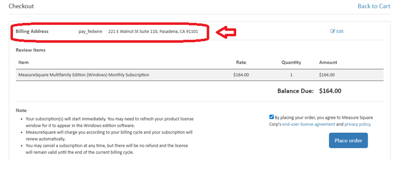 Step 1: Log into cloud.measuresquare.com with your MeasureSquare ID (email address) and password and create a subscription without payment method(you may enter billing address only).