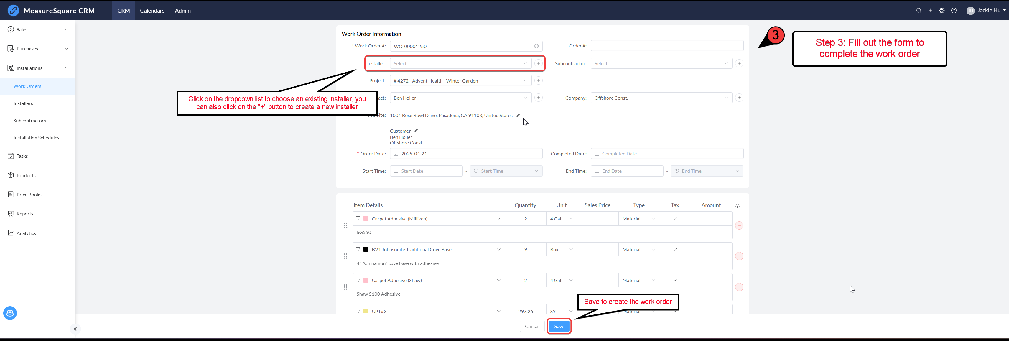 Complete the Work Order form by entering the required details: - Installer: Select an existing installer or click the "+" button to create a new installer. Click Save to finalize the Work Order.