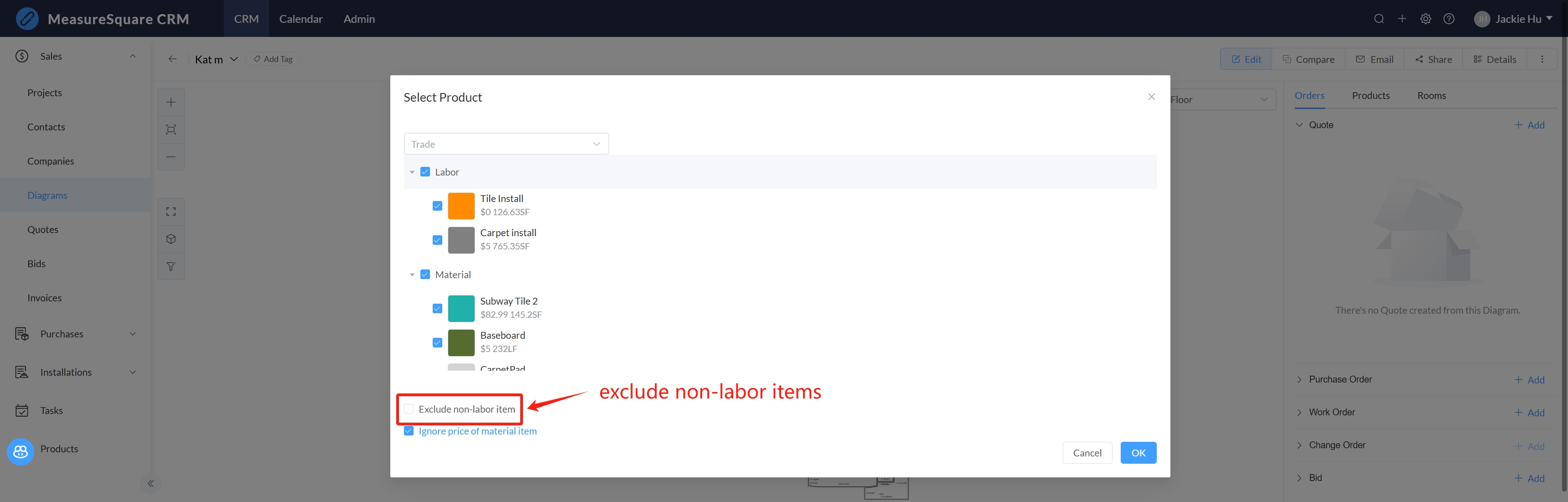 Step 2: Select the items you wish to include in your work order. MeasureSquare provides an option to easily exclude all non-labor items if desired. After selecting your items, click "OK" to proceed.