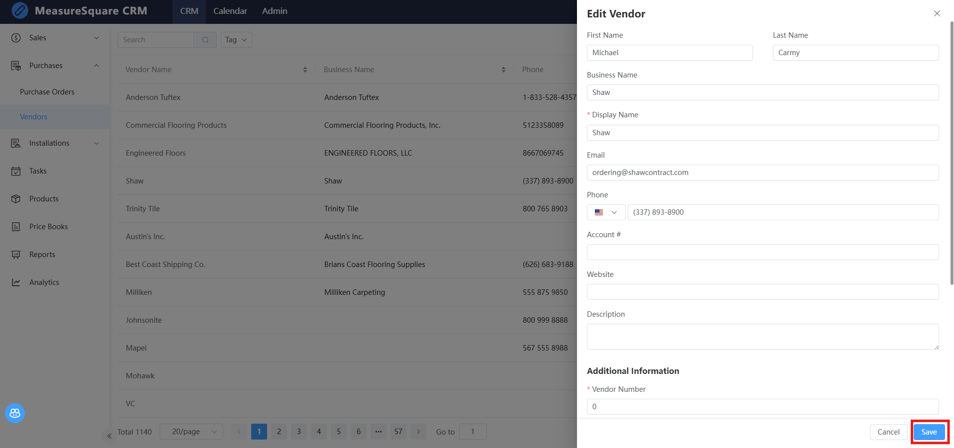 2. In the pop-up window, fill in the relevant information of the new Vendor. Click on Save button to save this Vendor to your MeasureSquare CRM Vendors list.