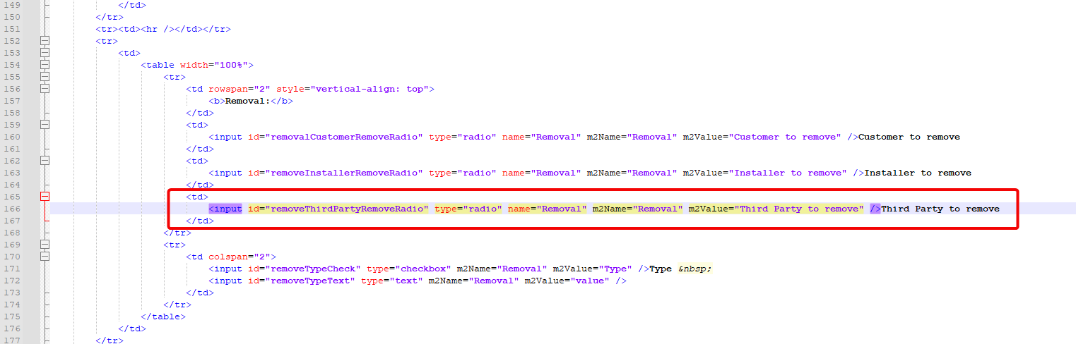 3. Make your desired changes to the form. To add more checkboxes or fields, simply copy what is already there. For example. adding the code highlighted below will create an additional button labeled "Third party to remove". Save when done.