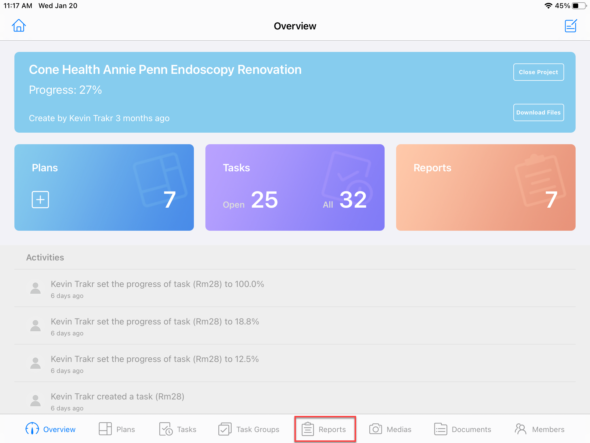Step 1: Go to the Project View > Tap on Reports icon on the bottom of the screen