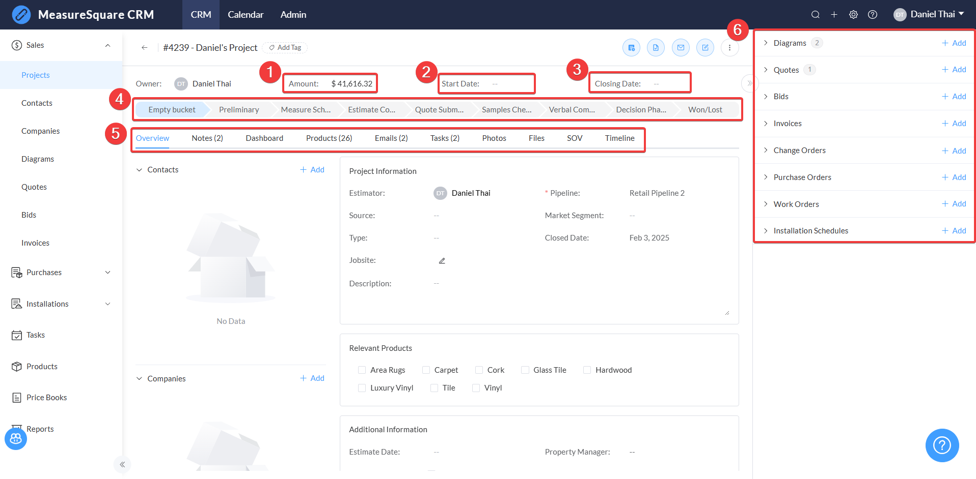 - Bids, Invoices, Change Orders, Purchase Orders, Work Orders, Installation Schedules: Manage all associated tasks and documents by clicking the Add button next to each category.