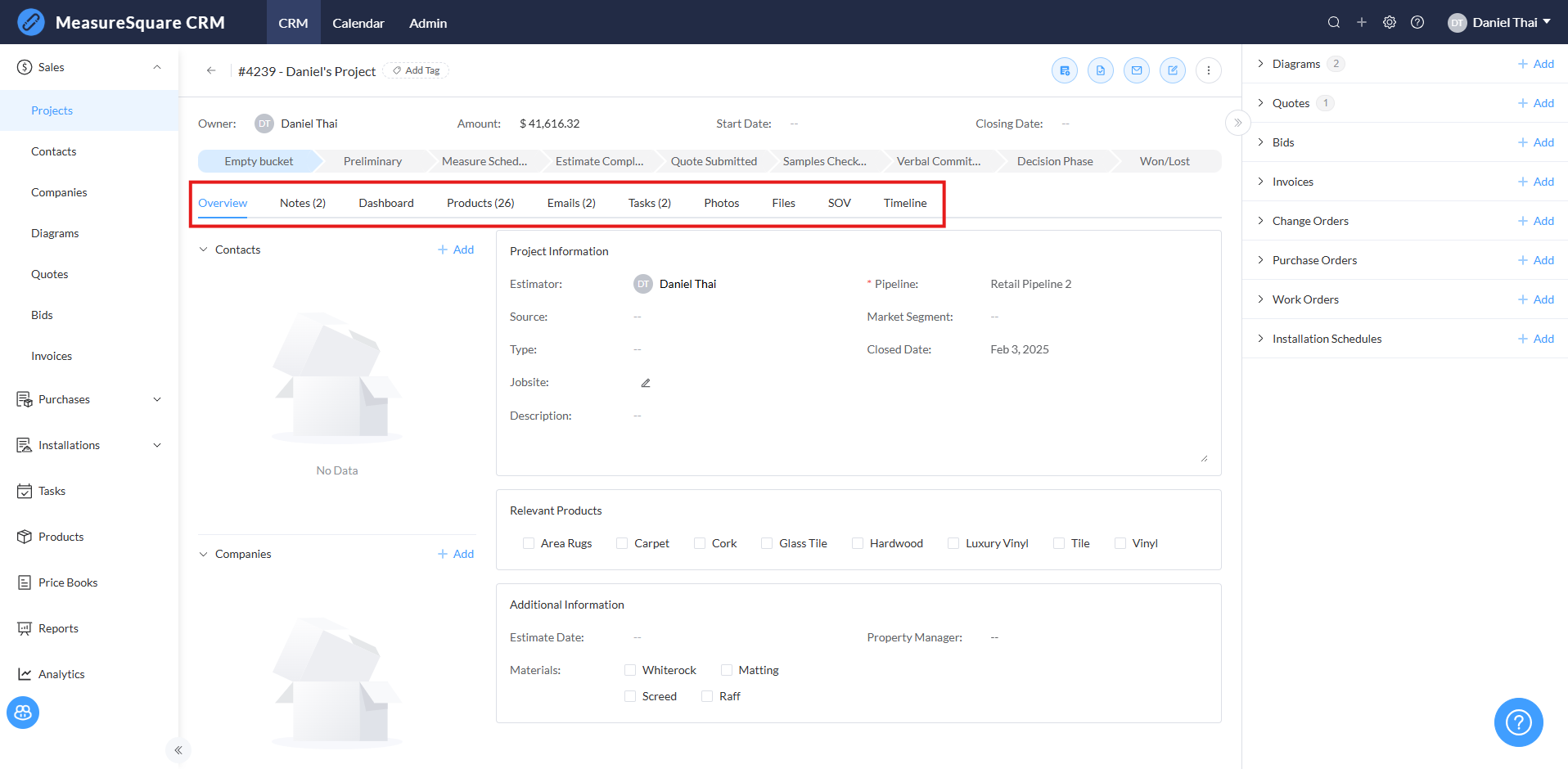 Project: Manage your project by moving the order of your project tabs along with selecting/deselecting your project tabs for your Projects.