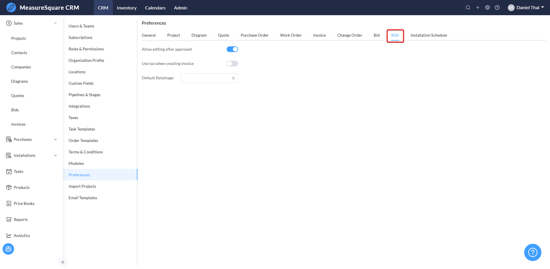 SOV: Allow edits to your SOV/payment application after approval along with allowing taxes when creating your invoices and manually input the Default Retainage % for your SOV.