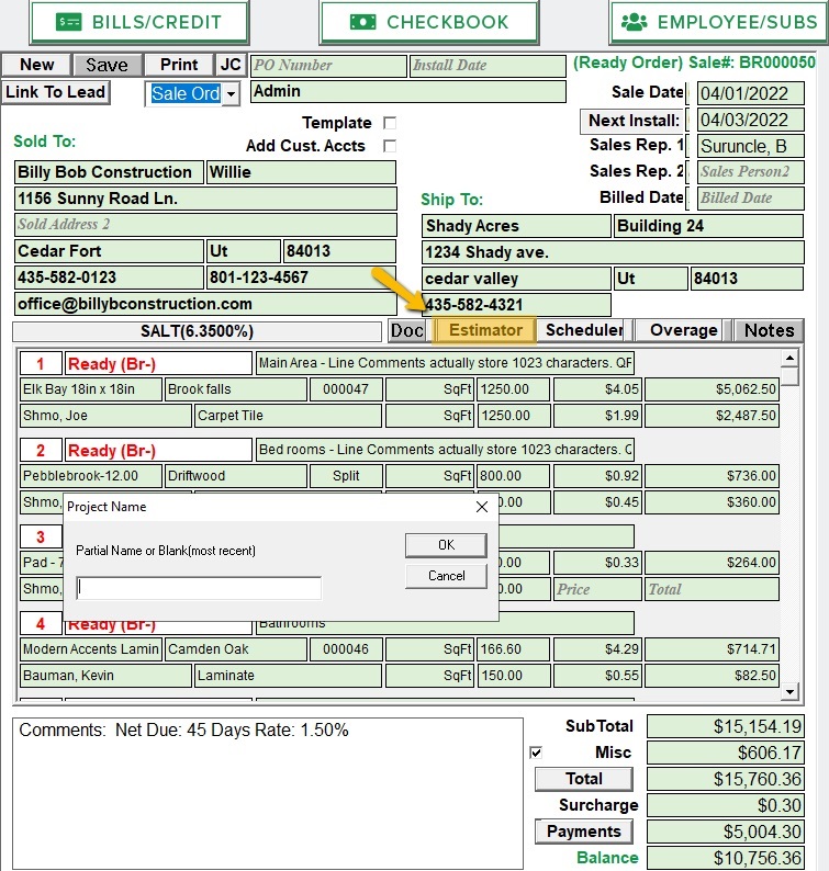 Step 4: To confirm it works you will want to create a new sale, save it, Click on the Estimator button, and you should have a Project Name pop up box come up.