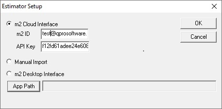 Step 3: Select Measure Square, Once you click on Measure Square the Estimator Setup window will come up. You will want to click the top option called m2 Cloud Interface. You will put your M2 ID and API Key in here then click OK.