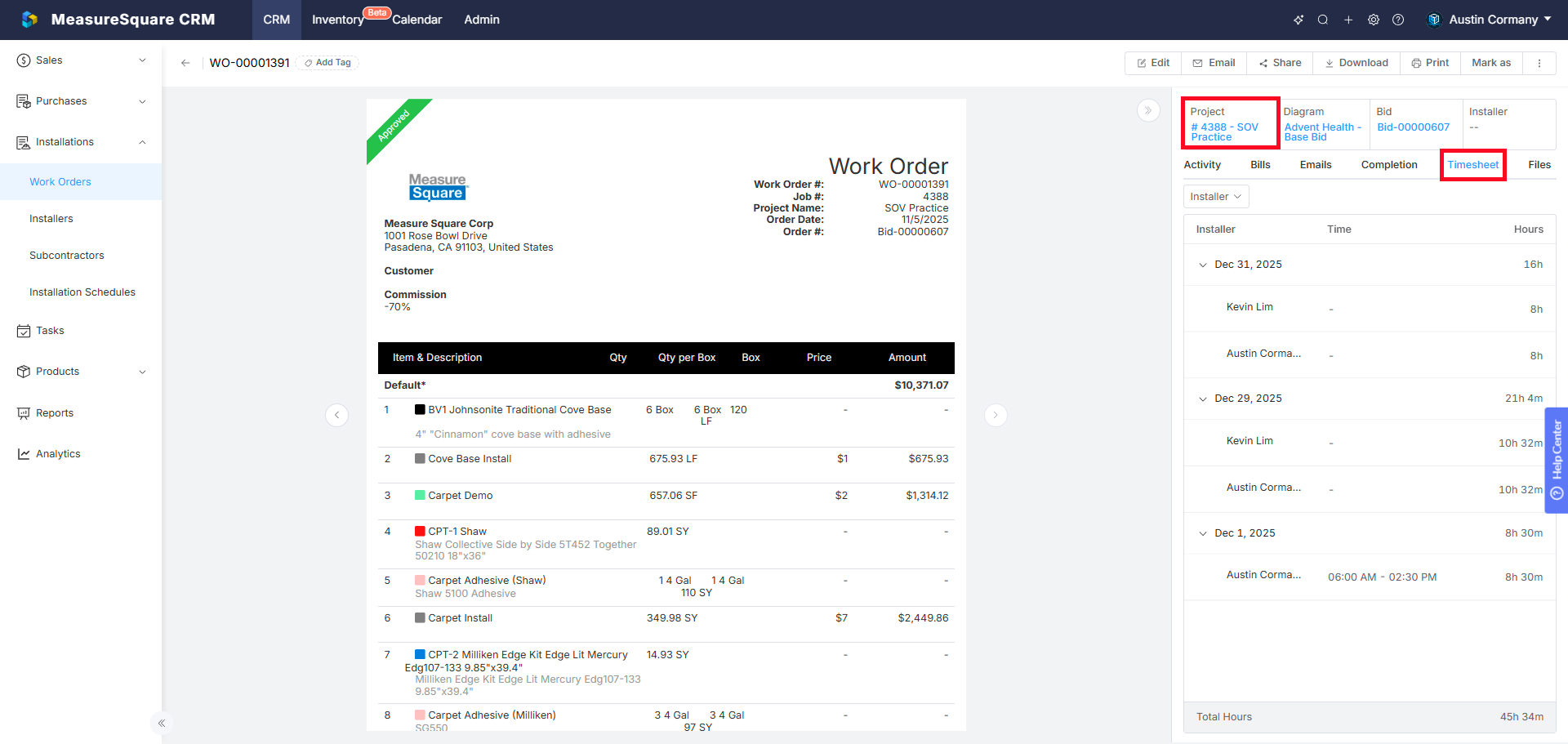 Team tracking within MeasureSquare CRM. Using Timesheets to see Worker hours by project