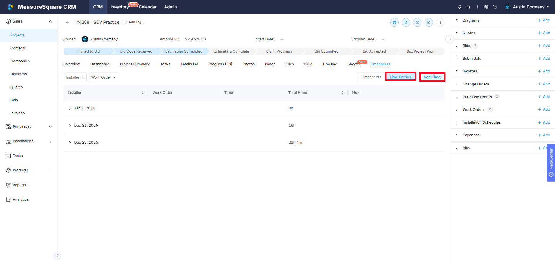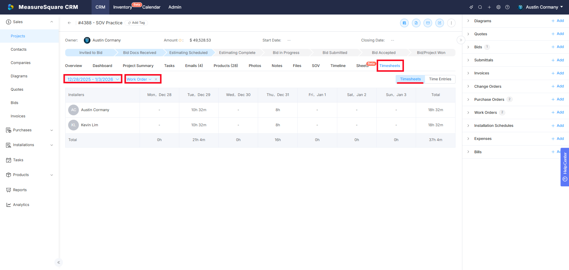 In this article we will cover how to input timesheets and view them inside projects for MeasureSquare CRM